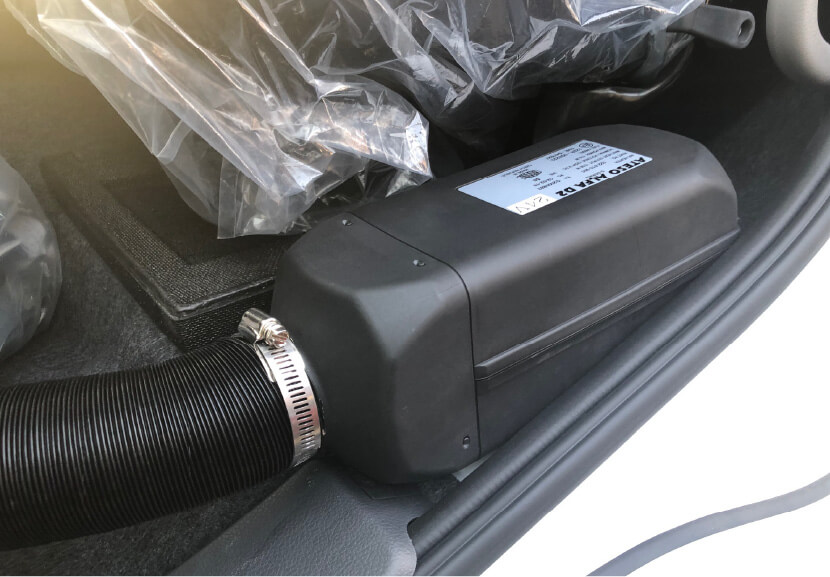 - アイドリングストップで使用でき、温度センサーにより風量をオートコントロールし車内の快適な温度をキープ。低電圧時のヒーターオートオフ機能。